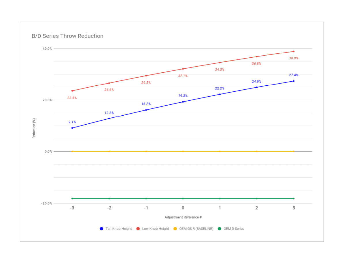 For over a year, we tested and examined the most popular B-Series shifters and realized that when placed at the optimal shift height the throw is over 90% longer than a stock OEM GS-R shifter, effectively becoming LONG shifters. We engineered a solution that does not compromise a shorter shift for optimal knob position. With our shifter set to its shortest throw setting, we achieved a throw that is 40% shorter than an OEM dual-bend shifter.